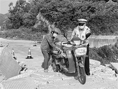 近日,受高温影响,临海市桃渚镇岩下村有一段水泥路面因膨胀而炸裂,桃渚交警第一时间安排警力在该路段做好警示,指挥车辆绕道。26日,执勤民警陈朝长发现,一大娘推着三轮电动车陷在水泥路面的裂缝中寸步难行,立即上前帮忙,合力将车辆推出障碍路段。