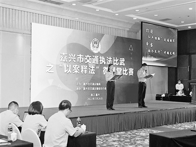 近日,嘉兴市举行交通执法比武之“以案释法”微课堂比赛,全市交通系统的24组选手参加。选手们选用近两年的真实案例,围绕案件事实、证据收集、法律适用、疑难问题等进行剖析、解读,宣传法律及业务知识,展示普法成果。经过2个多小时的比拼,嘉善县交通执法队荣获团体一等奖。通讯员 丁瑶 胡海星