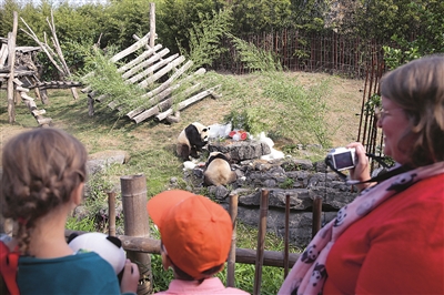 | 8月6日,在比利时布吕热莱特的天堂动物园,观众观看大熊猫“宝弟”(左)、“宝妹”享用“生日大餐”。 新华社记者 郑焕松 摄 |