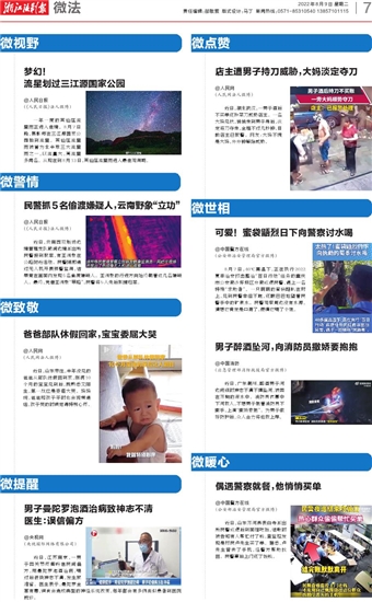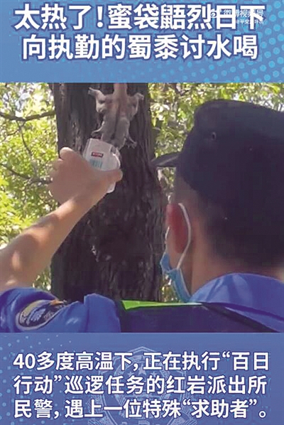 8月7日,40℃高温下,正在执行2022夏季治安打击整治“百日行动”任务的重庆市公安局沙坪坝区分局巡逻民警,遇上一名特殊“求助者”。一只萌萌的蜜袋鼯趴在树上,见到民警非但不跑,还眼巴巴地望着民警手中的矿泉水。民警观察周边没有水源,猜想它肯定是口渴了,便请它喝了个饱。