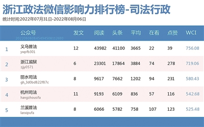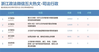 司法行政榜上,“义乌普法”也成为本期的黑马。值得一提的是,该公众号包揽了热文榜前三甲,其中《累计228例!关于义乌市新增34例新冠病毒阳性感染者的通报》居首。