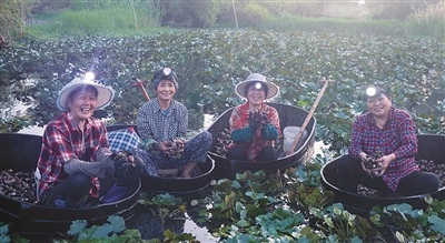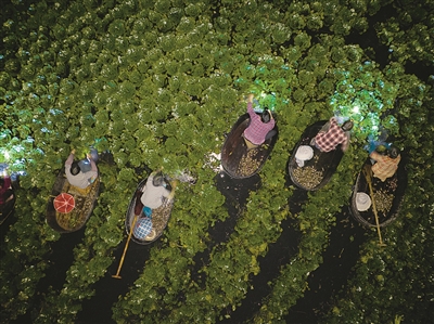 8月23日凌晨3点,德清县下渚湖街道四都村,村民趁着气温低一点划着菱桶采摘菱角。近年来,当地利用水塘、洼地种植100多亩菱角,带动当地农民增收致富。吕之遥 王建龙 摄