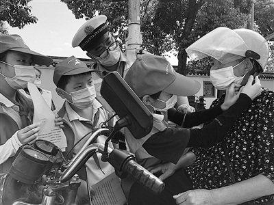 8月22日,临海市括苍镇道路上,一群“小交警”在交警的带领下,将一名未戴头盔的电动自行车驾驶员拦下,并现场宣传道路交通安全知识。