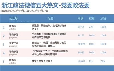 本期政法委榜上,“微嘉园”蝉联冠军宝座,其《请注意!周边杭州、上海又都有病例了!》一文以8万+的阅读量位居热文榜第一。不少网友留言表示:疫情防控,人人有责。