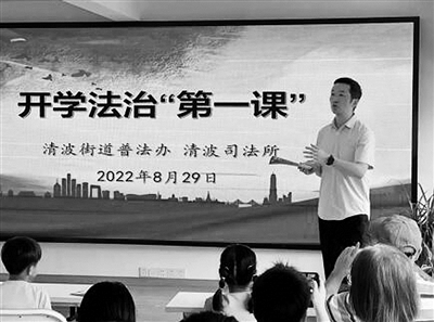 近日,杭州市上城区清波司法所联合清波街道普法办、各社区开展“开学法治第一课”活动。司法所工作人员、禁毒志愿者、消防员从预防未成年人违法犯罪、消防宣传、禁毒反诈等方面展开普法宣传教育,进一步增强青少年的法治意识。
