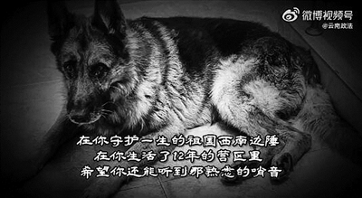 近日,云南勐康出入境边防检查站勐啊分站警犬“滨影”,因多器官衰竭、医治无效,永远离开了这个世界。据悉,“滨影”于2010年出生,参与查获毒品50多公斤。生前,它每天会跟着哨音一起叫;去世后,“滨影”被葬在营区,它还能听到熟悉的哨音。