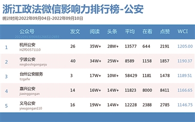 公安榜的冠军由“杭州公安”夺得。由“温州交警”发布的《新台风“梅花”生成!这个中秋节,@温州市民,出行一定要注意……》则获得了阅读量第一,文中对拥堵路段、高速公路流量等都作出了预测,很受群众欢迎。