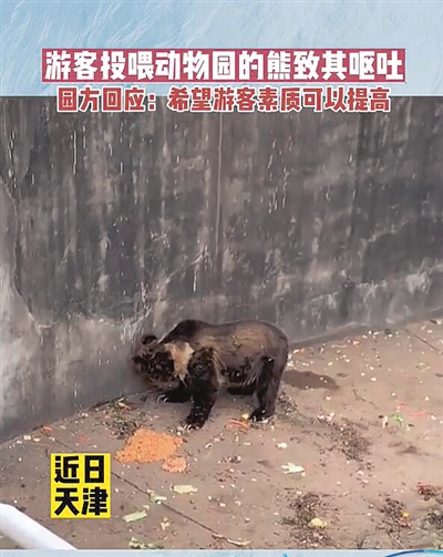10月9日,天津。有网友爆料称:游客向动物园的熊投喂导致熊呕吐。对此,天津动物园工作人员回应,在节日期间也雇了许多志愿者并且工作人员也一直在劝阻,园内也有禁止投喂牌子,后期会给熊检查救助,希望游客素质可以提高。