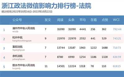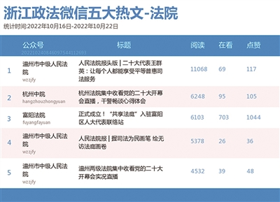 本期法院篇,“温州市中级人民法院”获“双料冠军”。热文榜榜首,《人民法院报头版|二十大代表王群英:让每个人都能享受平等普惠司法服务》一文获广泛关注。