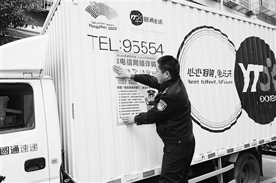 “趁他们还没开始忙,我们再去走访几家企业,做一些‘反诈包裹’。”老冯从随身的包里掏出一大叠“反诈贴纸”,上面列举了一些常见诈骗手段。