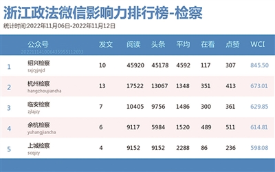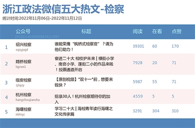本期检察院榜,前三名依次是“绍兴检察”“杭州检察”“临安检察”。其中,“绍兴检察”《谁能荣膺“枫桥式检察官”?请为他们助力!》一文获得热文榜第一。近日,绍兴市人民检察院组织开展“枫桥式检察官”评选活动,15名全市两级检察院的检察官入围。该文对入选检察官作了亮相介绍,并在线上开展投票活动,收获近4万网友的关注。