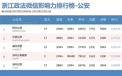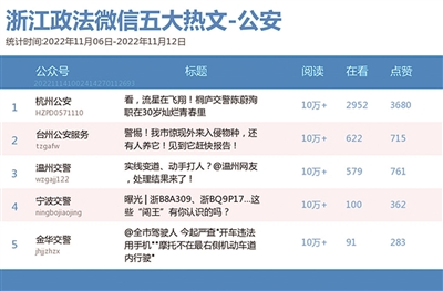 本期公安榜,“杭州公安”拿下公安影响力榜冠军,远超位列第二的“宁波公安”。热文榜上,阅读量达10万+的热文颇多,其中,“杭州公安”的《看,流星在飞翔!桐庐交警陈蔚殉职在30岁灿烂青春里》获得了最多点赞和“在看”数。许多人纷纷留言,一路走好,人民卫士。