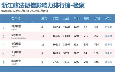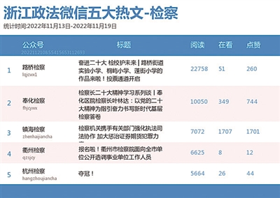 本期检察院榜上,黑马“路桥检察”拿下两榜榜首。其发布的热文《奋进二十大 检校护未来 | 路桥街道实验小学、桐屿小学、蓬街小学的作品来啦!投票通道开启》对“臻情护航 德法同行”2022年检校共建系列活动的参赛作品进行展播并投票,看来在新媒体开展活动是吸睛的一大利器。