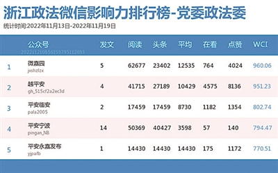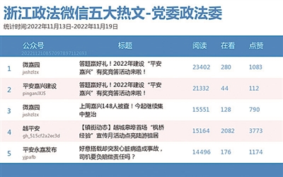 本期政法委榜,“微嘉园”持续霸榜。值得一提的是,该公众号发布的热文《答题赢好礼!2022年建设“平安嘉兴”有奖竞答活动来啦!》居热文榜榜首。有奖竞答活动让网友们既能涨知识,又能拿礼品,颇受欢迎,是公众号涨粉的不二之选。