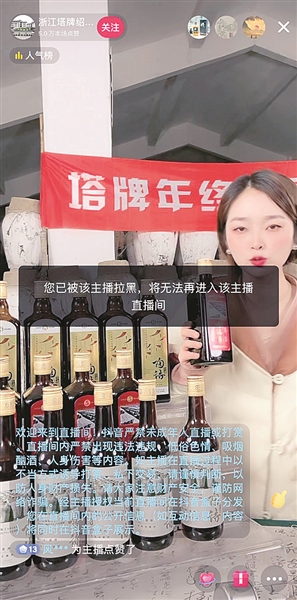 12月11日晚,记者进入抖音塔牌官方旗舰店,亲身经历了“洗客”。当晚直播间正在推销一款塔牌绍兴酒公司生产的22公斤装黄酒,附加优惠赠送后售价348元。记者立即查询了淘宝的塔牌酒类旗舰店,发现同款产品“双十二”优惠价显示298元,而塔牌绍兴酒公司官网链接的天猫店优惠价为300元。于是记者在直播间留言“比淘宝旗舰店卖的贵”。留言发出后为了引起主播关注,记者立即又打了一条同样内容的留言,正要发布,却发现已经被直播间主播拉黑。