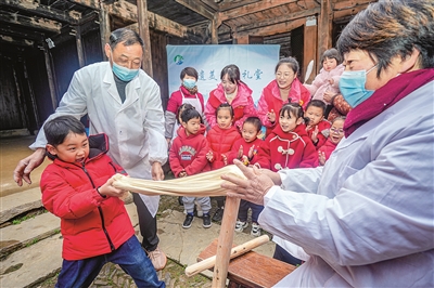 12月12日,长兴县煤山镇东风村文化礼堂内,槐坎中心幼儿园的孩子们在制作、品尝各种乡土美食。入冬以来,制作麦芽糖、糖葫芦等是当地农家习俗。部分学校开展了“品乡土美食,学家乡文化”活动,让孩子们通过近距离观摩、动手制作传统美食,感受家乡传统文化。