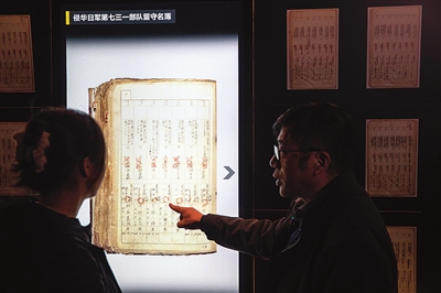 | 工作人员介绍新展出的《关东军防疫给水部留守名簿》 |