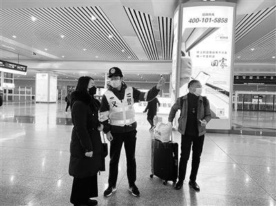 “请问有什么能够帮到您?”2023年春运即将开始,杭州东站的“黄马甲”又忙碌起来。图为1月4日,“东哥东姐”为旅客提供贴心服务。
