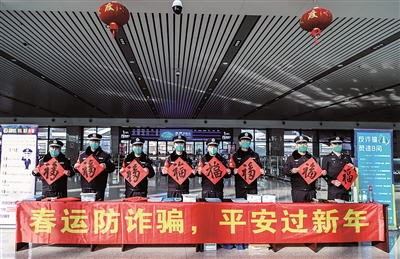 春运首日,杭州铁路公安处湖州站派出所在湖州高铁站举行“春运防诈骗 平安过新年”2023年春运首日防诈宣传活动。民警精心准备了防诈安全知识宣传册、宣传展板、铁路禁止或限制携带物品等,向旅客讲解反诈小技巧、解读铁路禁止或限制携带物品、宣讲乘车出行安全知识,书法爱好民警还现场撰写“福”字赠送给旅客,并赠送防疫口罩。