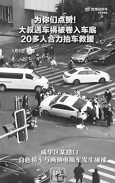 1月5日,四川成都,一辆小轿车与电瓶车发生碰撞,电瓶车驾驶员被卷入车底。危急时刻,来自街边商铺的商家和路过群众共20多人,用时一分钟左右,合力将卷进车底的中年大叔成功拉出。随后,120急救人员和警方赶到现场,伤者被第一时间送医治疗。