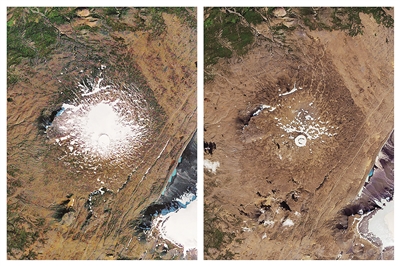 这是由美国航天局提供的1986年9月14日(左)和2019年8月1日冰岛奥克冰川卫星图。