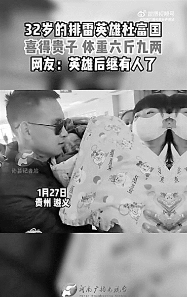 1月27日,贵州遵义,排雷英雄杜富国喜得贵子。2018年10月,27岁的杜富国在排雷时突遇爆炸,永远失去了双手和双眼。经过三年多康复治疗,杜富国恢复情况良好,如今已重回部队。网友:排雷英雄杜富国又多了一个身份,祝宝宝健康快乐!