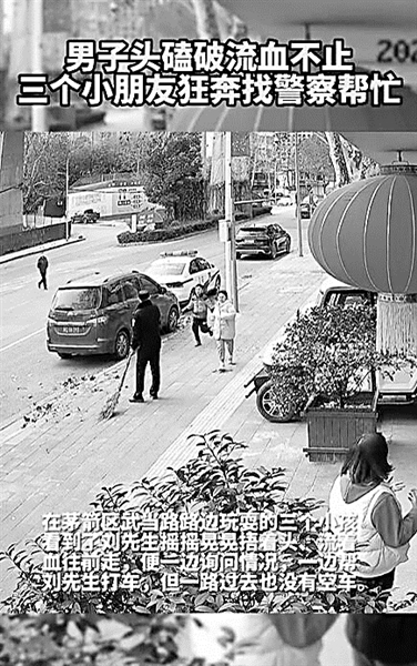 近日,湖北十堰,市民刘先生不慎摔倒,致头部受伤流血不止。此时,在路边玩耍的3个小朋友看到刘先生摇晃着捂着头、流着血往前走,便一边询问情况,一边帮刘先生打车,但一路过去也没有空车。3个小朋友打不到车,便一路飞奔找到派出所,向民警求助。值班民警赶来将刘先生送医。经救治,刘先生没有大碍。