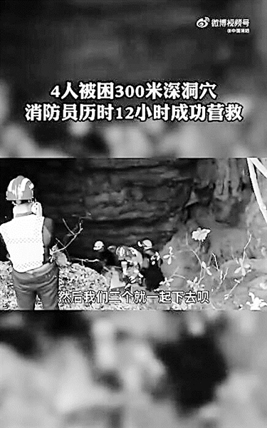 近日,广西河池,4人进入深山岩洞探险失联。消防员携带救援装备徒步进山,经现场勘查发现,洞穴垂直深度约300米,洞壁有大量碎石,内部空气湿闷稀薄,救援难度极大,救援人员几经往返洞穴,沿途制作山体锚点,确定被困人员位置后,投放水和食物帮其恢复体力,历时12小时终于将被困人员安全救出。消防提示:外出游玩时请勿到不熟悉地带探险,安全第一。