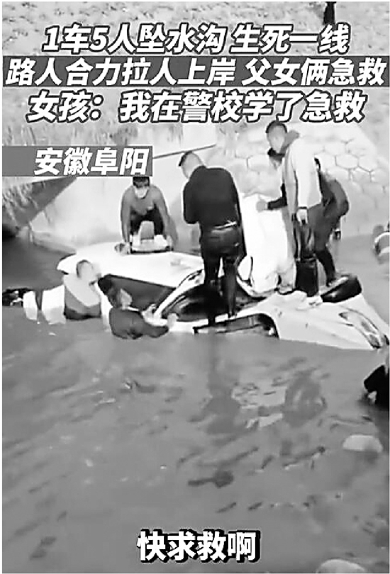 | 1车5人坠水沟生死一线 警校学生与众人合力施救全部救回 @人民日报 (《人民日报》法人微博) 近日,安徽阜阳,1车5人坠入水沟生死一线,此时警校学生吕智慧和父亲吕振康恰好驾车路过。危急时刻,岸边上演了一场紧急救援,父亲跳水救人,女儿跪地做人工呼吸,与众人合力将被困人员全部救回。 |