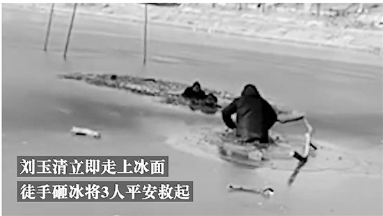 | 3小孩坠冰窟 男子徒手砸冰全救起 @人民网 (人民网法人微博) 1月29日,河南郑州,刘玉清与妻儿遛弯时,发现3个小孩在人工湖上玩耍,不慎掉入冰窟窿。情况紧急,刘玉清立即上前,徒手砸冰将3人平安救起。事后,妻子王女士表示,当时自己吓坏了,老公为了救人手部受轻伤,好在3个孩子都平安无事。 |