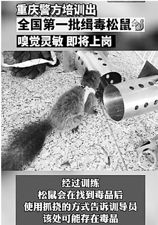 近日,重庆警方在警犬大队技术指导下,成功培训出中国第一批6只缉毒松鼠。选取的松鼠品种为“魔王松鼠”,嗅觉非常灵敏,已通过相关科研机构认证。经训练,松鼠在找到毒品后,会用抓挠的方式告诉训导员该处可能存在毒品。