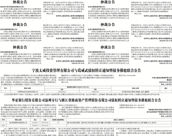 根据转让方宁波太威投资管理有限公司与受让方葛威武签署的《债权转让协议》,宁波太威投资管理有限公司已将其对下列借款人及其担保人享有的债权项下全部权利(包括但不限于主债权、担保债权<保证和抵押担保>、违约金债权、利息债权、损失赔偿权)依法转让给葛威武。宁波太威投资管理有限公司与葛威武联合公告通知借款人及担保人以及其他相关各方。