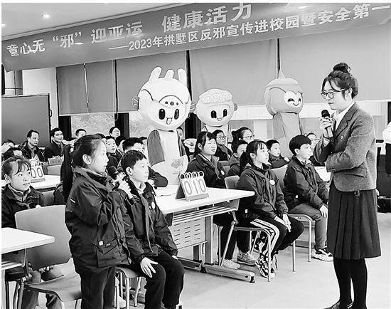 本报讯 2月8日下午,杭州市拱墅区委政法委联合区公安分局、区教育局、区反邪教协会、文晖街道等,在杭州市现代实验小学举办“童心无‘邪’迎亚运 健康活力‘星’少年”主题的校园反邪教“开学第一课”活动。