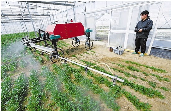 | 2月15日,在嘉兴市南湖区凤桥镇一个有机农业园的蔬菜大棚内,工作人员遥控操作植保机器人进行施肥作业。 新华社 徐昱 摄 |