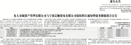 光大金瓯资产管理有限公司与宁波定顺贸易有限公司债权转让通知暨债务催收联合公告