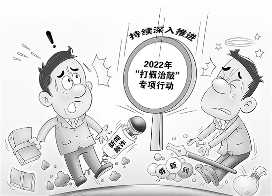 | 2022年中宣部联合中央网信办、最高人民法院、最高人民检察院、外交部、工业和信息化部、公安部、国家税务总局、国家市场监督管理总局、国家广播电视总局、国务院港澳办、证监会、中华全国新闻工作者协会12个部门,精心组织、统筹调度,指导推动各地区各相关部门单位不断把打击新闻敲诈和假新闻专项行动(简称“打假治敲”专项行动)向纵深推进,取得了新进展新成效。 新华社 王琪 作 |