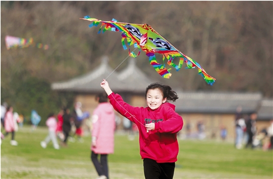 2月19日,小朋友在江苏扬州市风筝广场放风筝。