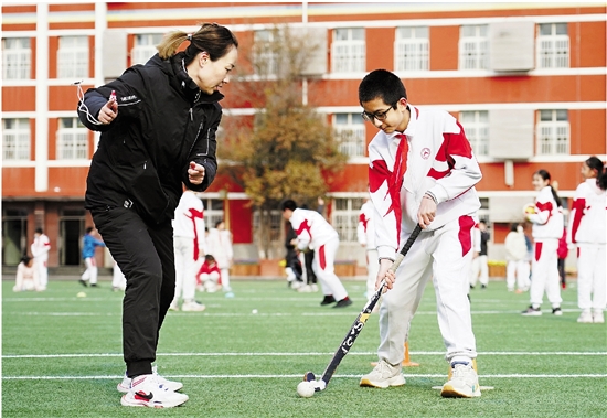 | 2月21日,在北京的人大附中实验小学,体育教师张颖(左)在体育课中指导学生进行曲棍球基本技术动作练习。 近日,各中小学生迎来新学期。一些学校开展健身健美、极限飞盘、旱地冰球等特色体育课,在丰富学生校园文体生活的同时,助力学生健康成长。 新华社 任超 摄 |