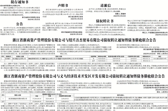 根据法律及财政部、银监会的有关规定,以及浙江省浙商资产管理股份有限公司与义乌经济技术开发区开发有限公司签署的《资产转让合同》,浙江省浙商资产管理股份有限公司已将其对下列借款人及其担保人项下享有的全部权利(包括但不限于主债权、担保债权、违约金债权、利息债权、损失赔偿权)依法转让给义乌经济技术开发区开发有限公司。浙江省浙商资产管理股份有限公司与义乌经济技术开发区开发有限公司联合公告通知各借款人及担保人以及其他相关各方。