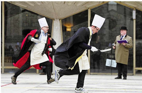 2月21日,在英国伦敦,人们参加“颠煎饼跑”比赛。