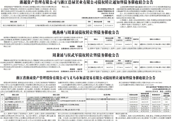 根据浙越资产管理有限公司与浙江浩禄置业有限公司签订的债权转让协议,浙越资产管理有限公司将其对公告清单所列借款人及其担保人享有的主债权及担保合同项下的全部权利,依法转让给浙江浩禄置业有限公司。浙江浩禄置业有限公司作为上述债权的受让方,现公告要求公告清单中所列借款人及担保人,从公告之日起立即向浙江浩禄置业有限公司履行主债权合同及担保合同约定的还本付息义务及相应的担保责任。