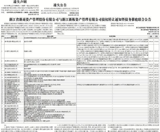浙江浙栋资产管理有限公司作为上述债权的受让方,现公告要求下列借款人及其相应的担保人或其承继人,从公告之日起立即向浙江浙栋资产管理有限公司履行主债权合同及担保合同等相关法律文件项下约定的偿付义务或相应的担保责任。