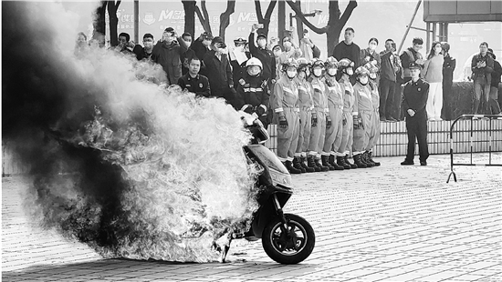 近日,衢州市消防救援支队联合市场监管、经信等部门,开展全市“3·15”消防产品暨电动自行车联合执法宣传培训活动。图为一辆用于实测演示的电动自行车仅6分钟就被完全烧毁。