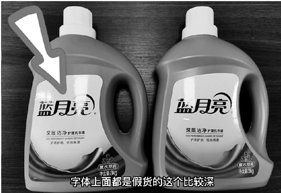 民警介绍,与真的相比,假“蓝月亮”的认证标识不管是顺序还是大小都不一样,而真品还标有可回收包装的认证。同时,假“蓝月亮”液体颜色较深,表层看不到泡沫;真的颜色较浅,表层布满细微小泡沫。