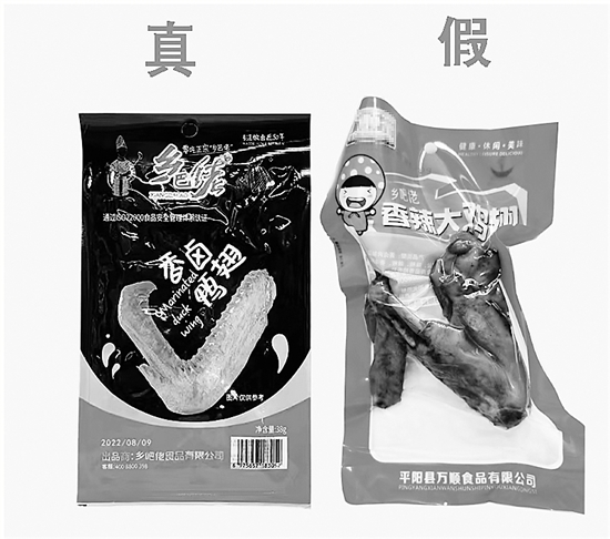 民警介绍,真的“乡巴佬”商标旁会有注册商标“R”的标志。假的则常常在相似字上做文章,比如用“吧”代替“巴”。