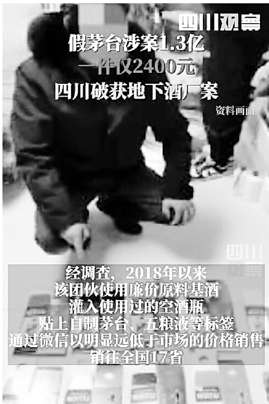 经调查,2018年以来,该团伙使用廉价原料基酒灌入使用过的空酒瓶,贴上自制茅台、五粮液等标签,通过微信以明显远低于市场的价格销售,销往全国17省。