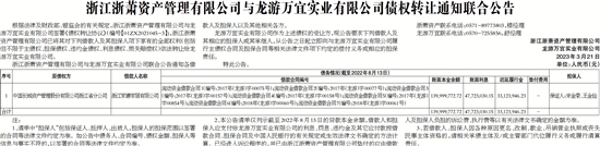 根据法律及财政部、银监会的有关规定,浙江浙萧资产管理有限公司与龙游万宜实业有限公司签署《债权转让协议》(编号【01ZX2021045-3】),浙江浙萧资产管理有限公司已将其对下列借款人及其担保人项下享有的全部权利(包括但不限于主债权、担保债权、违约金债权、利息债权、损失赔偿权)依法转让给龙游万宜实业有限公司。