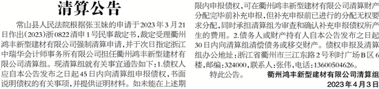 特此公告。 衢州鸿丰新型建材有限公司清算组