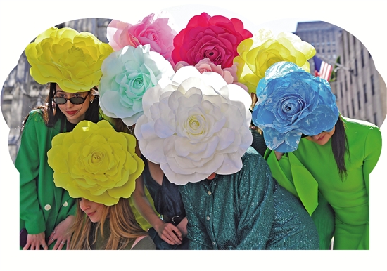 当日是西方传统节日复活节,人们头戴精心制作的花帽,在纽约第五大道参加一年一度的复活节游行。