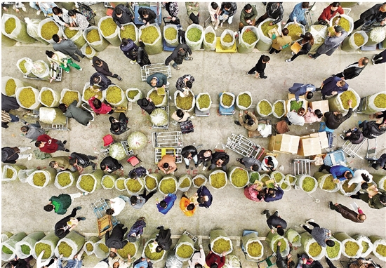 4月10日,各地茶商在松阳县浙南茶叶市场选购茶叶。清明过后,浙南茶叶市场依然交易闹猛。据悉,浙南茶叶市场是全国最大的绿茶产地市场和绿茶指数发布地,市场辐射全国1000余万亩茶园、150多万茶农。今年1-3月,浙南茶叶市场实现茶叶交易4582吨,交易额19.2亿元,交易均价419元/公斤。 通讯员 陈碧鑫 周敏岚 摄